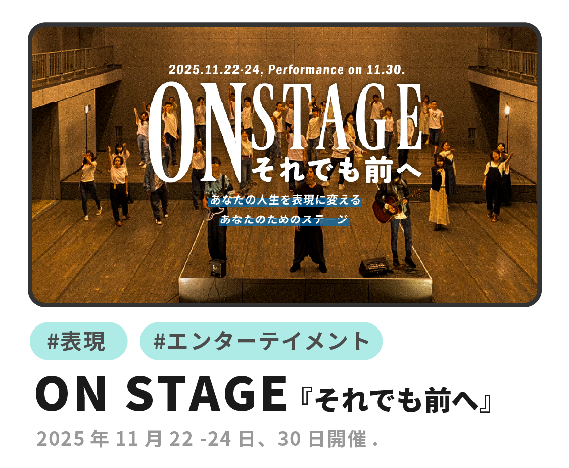 自分と向き合い、自分の経験や人生を パフォーマンスに変えステージに立つ 2泊3日と本番1日がセットの企画です。 上手い下手は一切関係なし。 歌、ダンスの経験も一切問いません。 あなたの人生を表現に変える。 ここは、あなたのためのステージ。