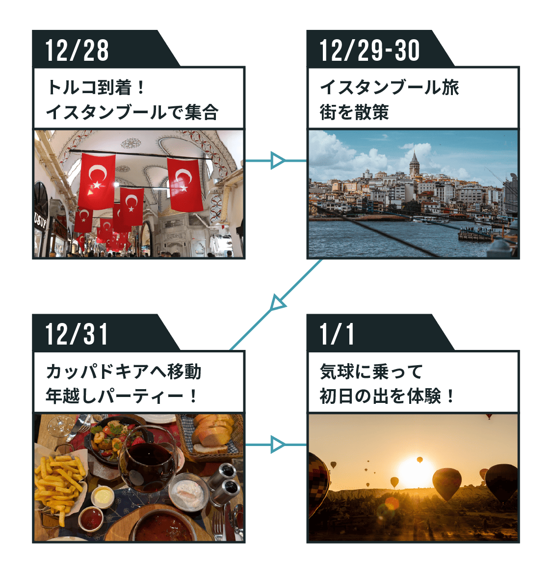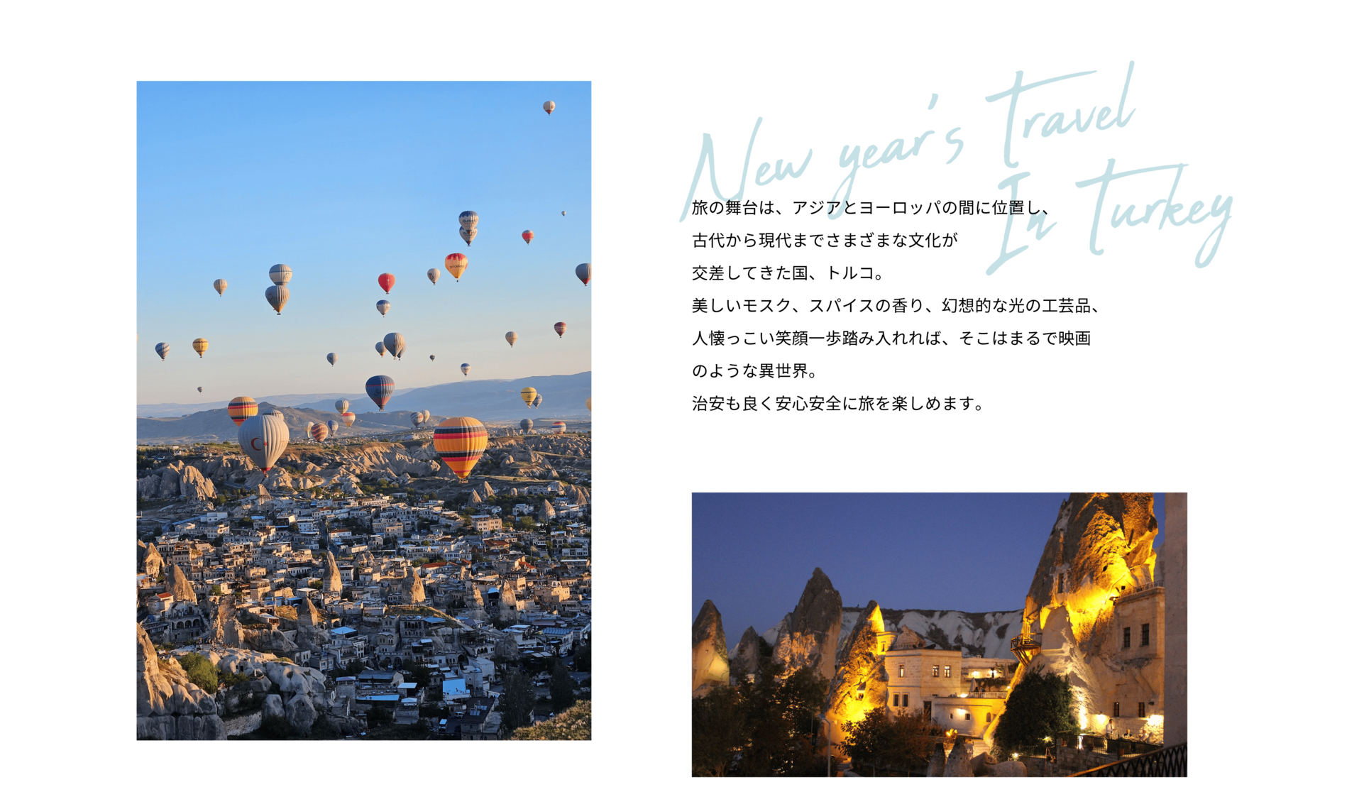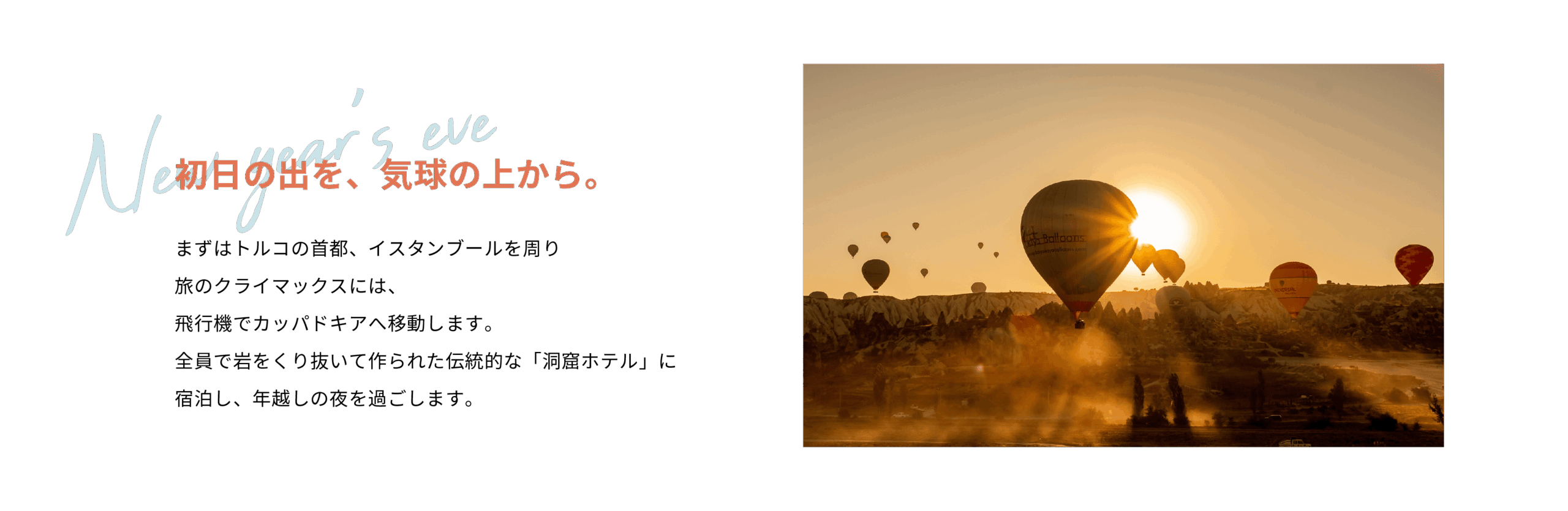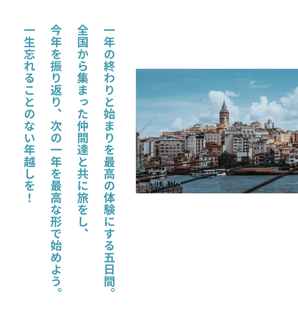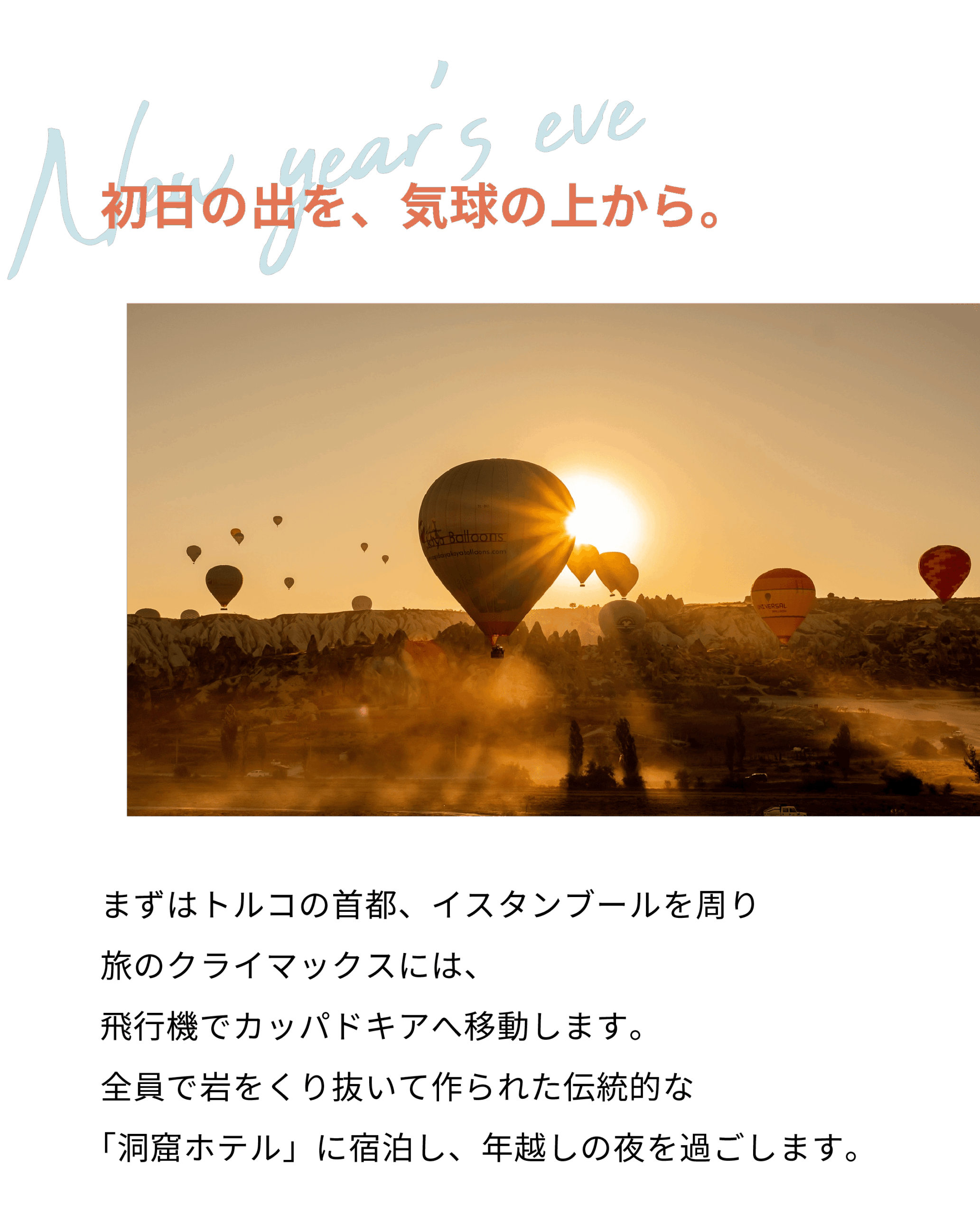 憧れの海外での年越しを、日本全国から集まった仲間達と共に実現する企画です。 トルコのイスタンブールを旅し、カッパドキアで洞窟ホテルで年を越し、気球から朝日を見る、そんな最高の年越しを!