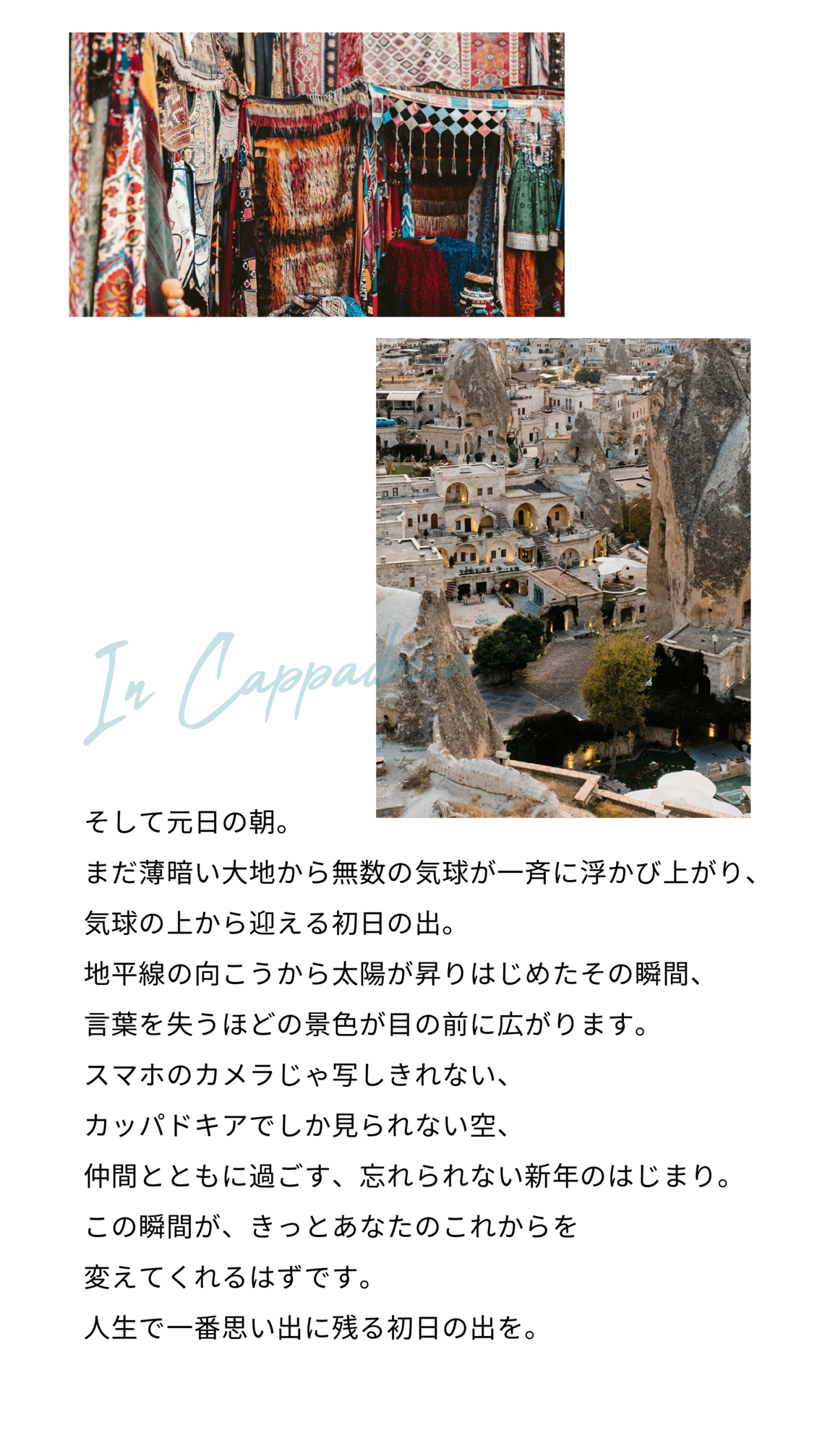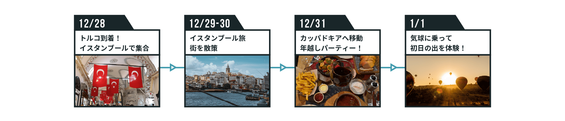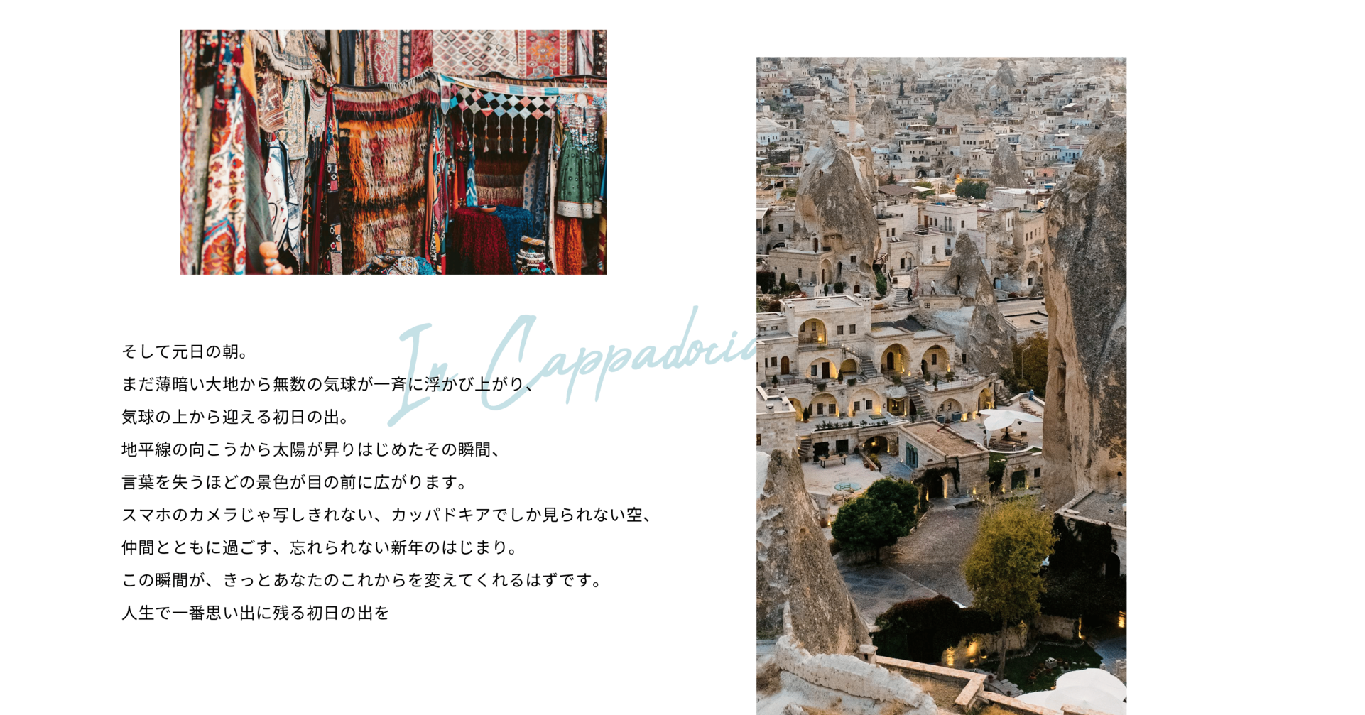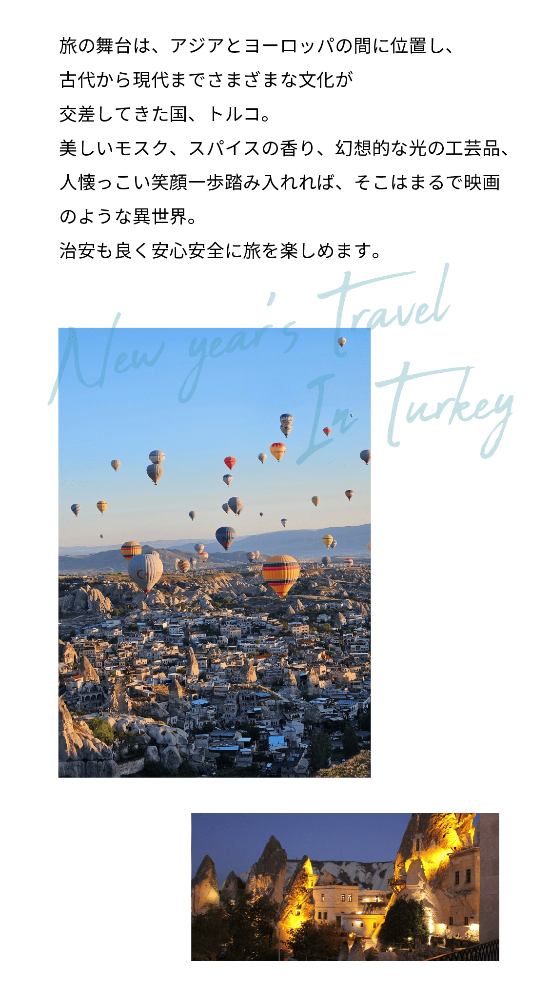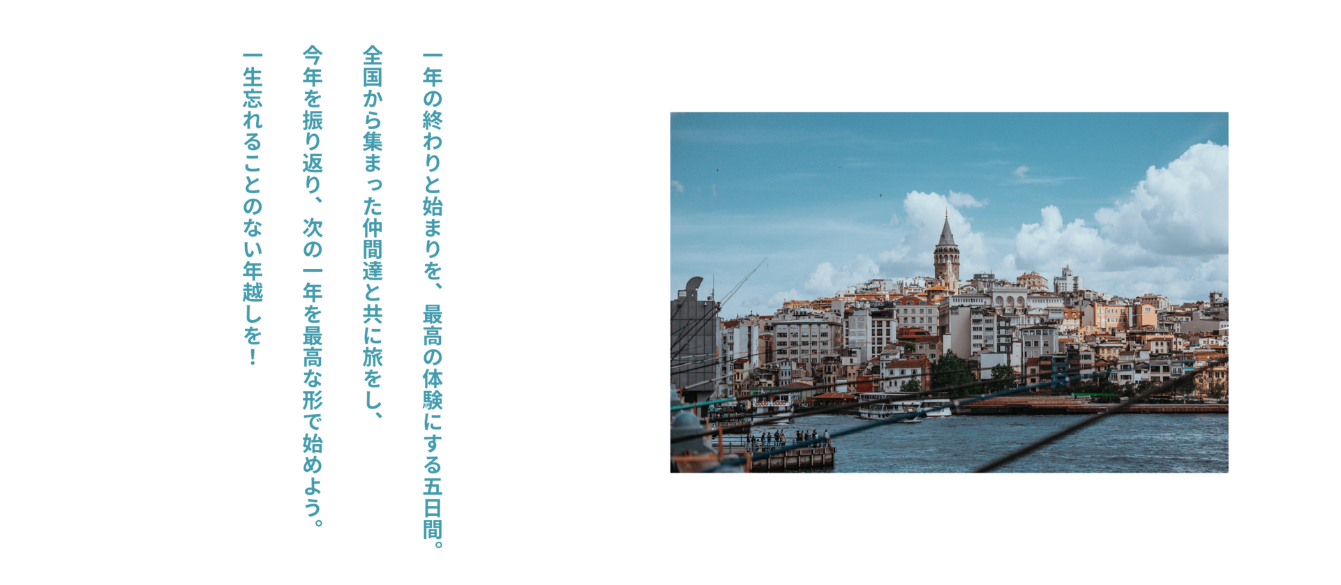 憧れの海外での年越しを、日本全国から集まった仲間達と共に実現する企画です。 トルコのイスタンブールを旅し、カッパドキアで洞窟ホテルで年を越し、気球から朝日を見る、そんな最高の年越しを!
